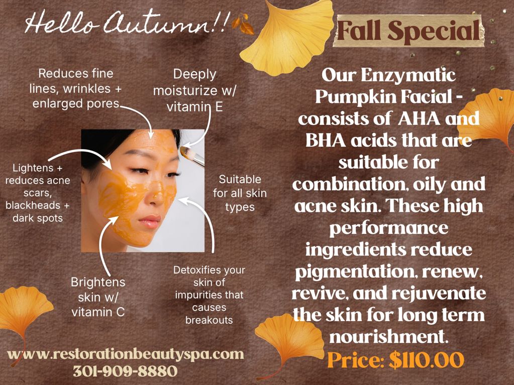 Glow starts here. Our Enzymatic Pumpkin Facial combines the power of AHA and BHA acids to deeply exfoliate, clarify, and rejuvenate your skin. Perfect for combination, oily, and acne-prone skin, this results-driven treatment helps fade pigmentation, smooth texture, and reveal a fresh, radiant complexion. Powered by natural enzymes and professional-grade actives, it’s your g